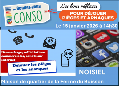 Vente forcée, hameçonnage, fraude à la carte bancaire, numéros surtaxés, services administratifs payants, investissements financiers douteux, mails alarmistes… Les façons de se faire arnaquer pullulent, que ce soit par téléphone, par mail, par SMS, lors d’un démarchage, sur Internet pour un achat en ligne, lors d’un appel à un dépanneur… Pour décrypter ces situations et délivrer quelques conseils pour s’en prémunir, l’association de consommateurs UFC-Que Choisir propose une réunion de sensibilisation jeudi 15 janvier à 14 h 30 à la Maison de quartier de la Ferme-du-Buisson. Renseignements et inscription auprès du secteur Retraités (01 60 37 73 66) ou par mail à retraites@mairie-noisiel.fr